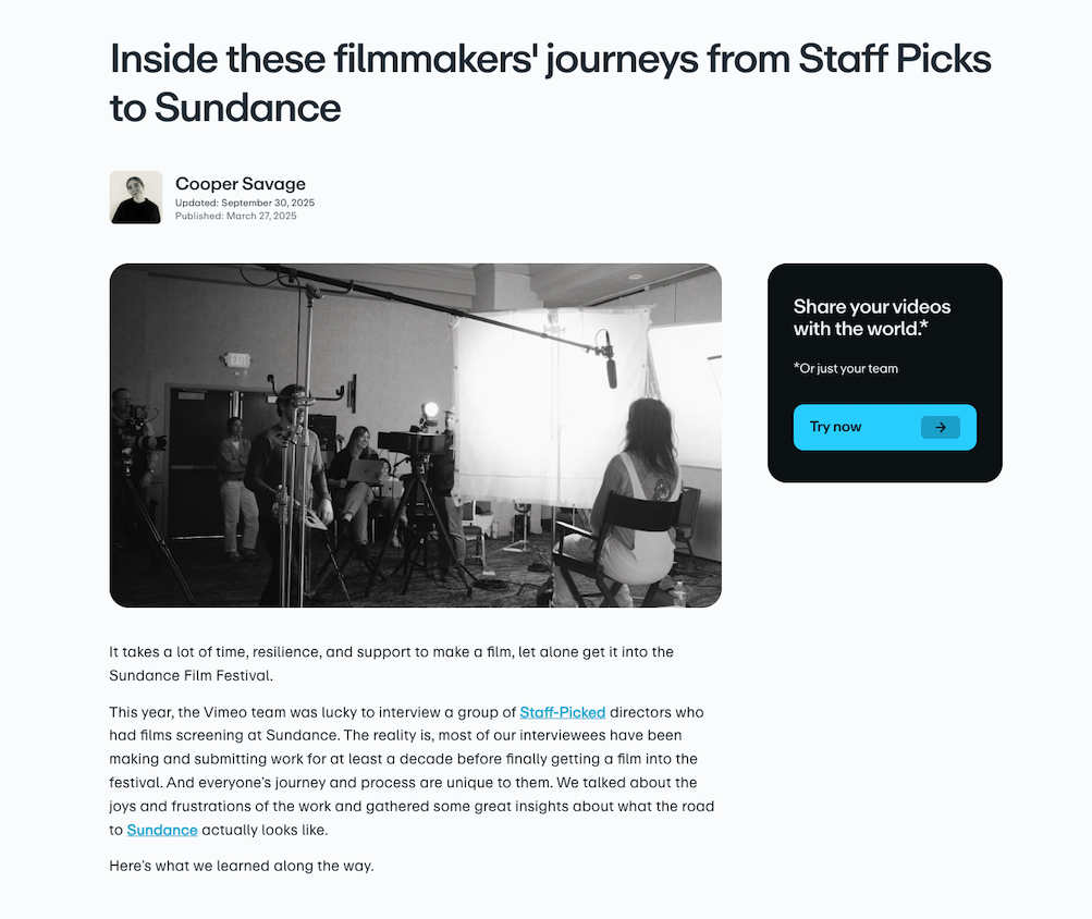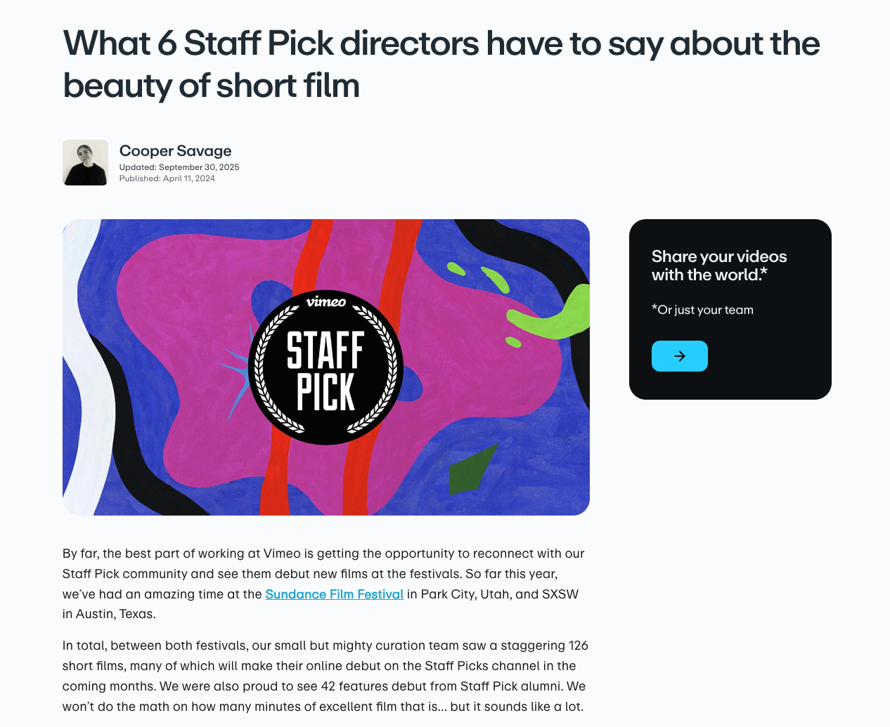 Interviewing creators is one of the most rewarding parts of my work. At Vimeo, I talk with Staff Pick filmmakers and translate their creative process into engaging stories. From shaping interview strategy to guiding conversations and crafting the final narrative, I focus on showing how great work comes to life.